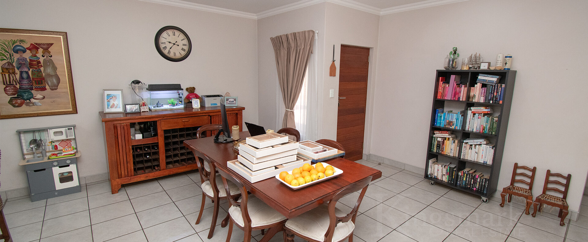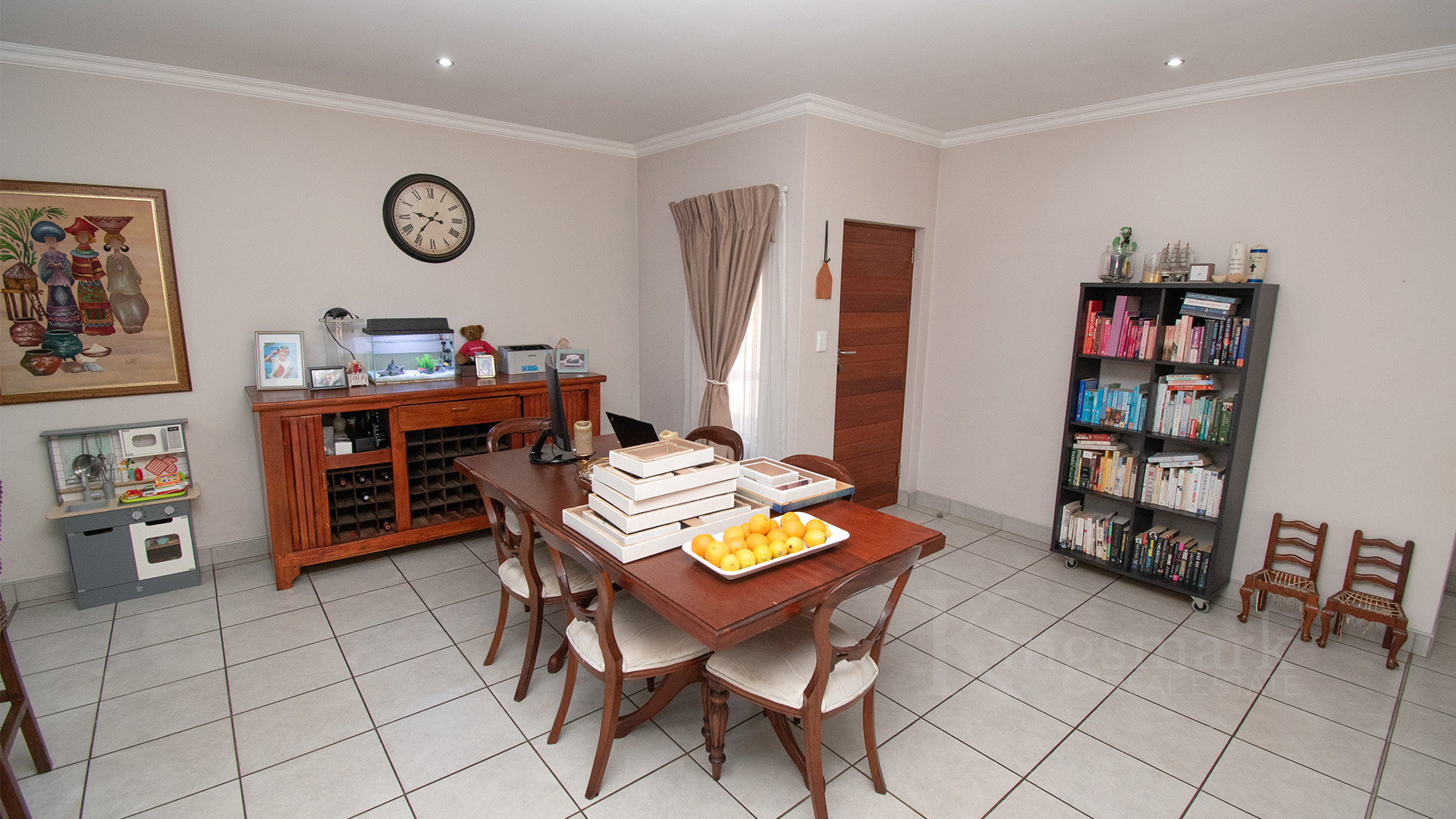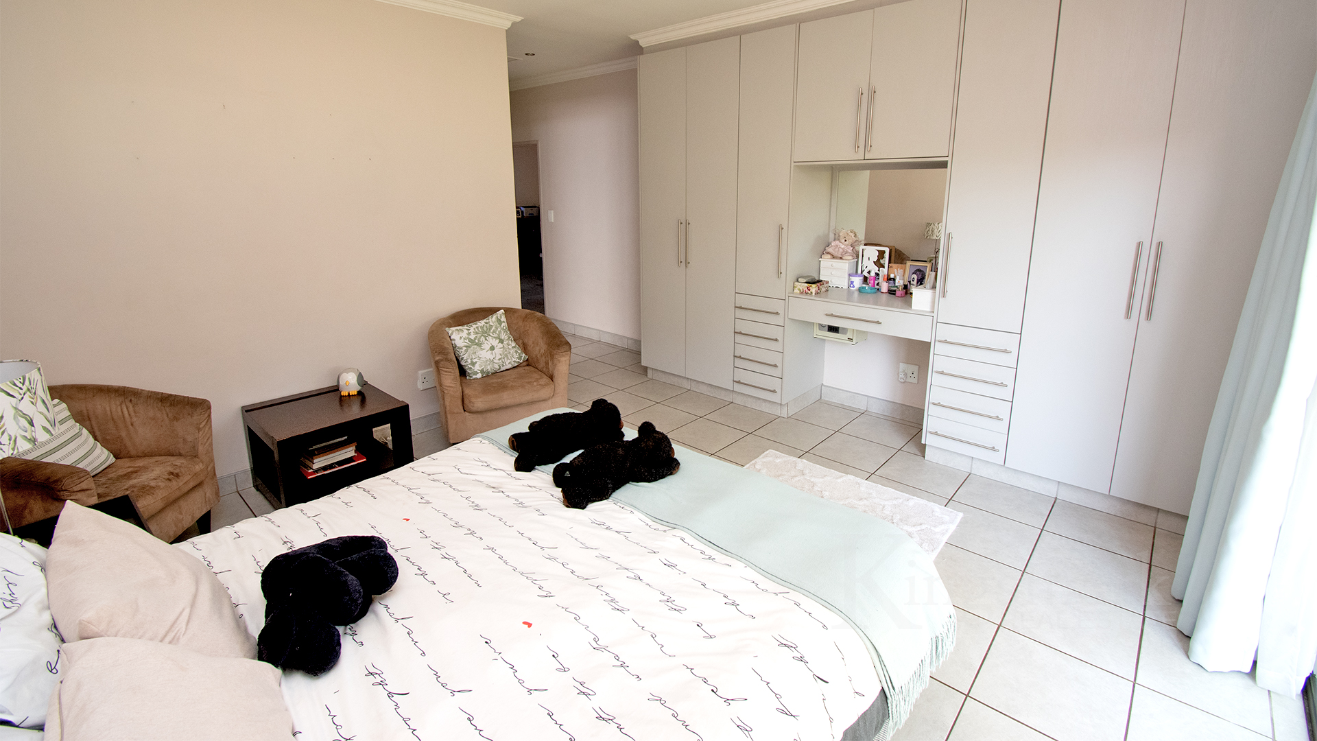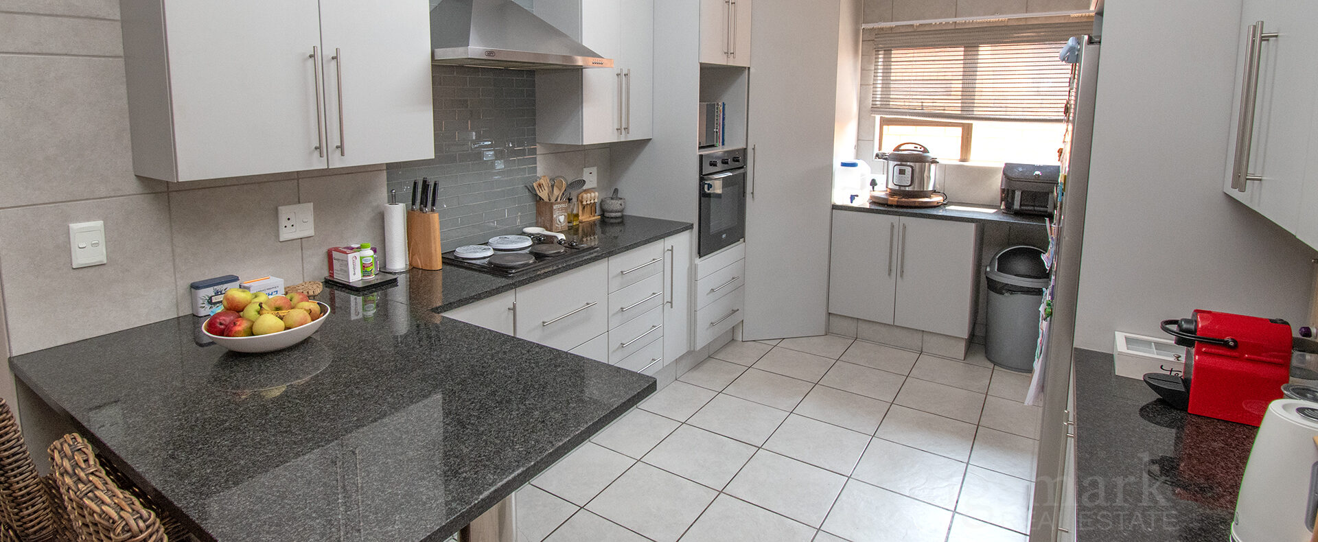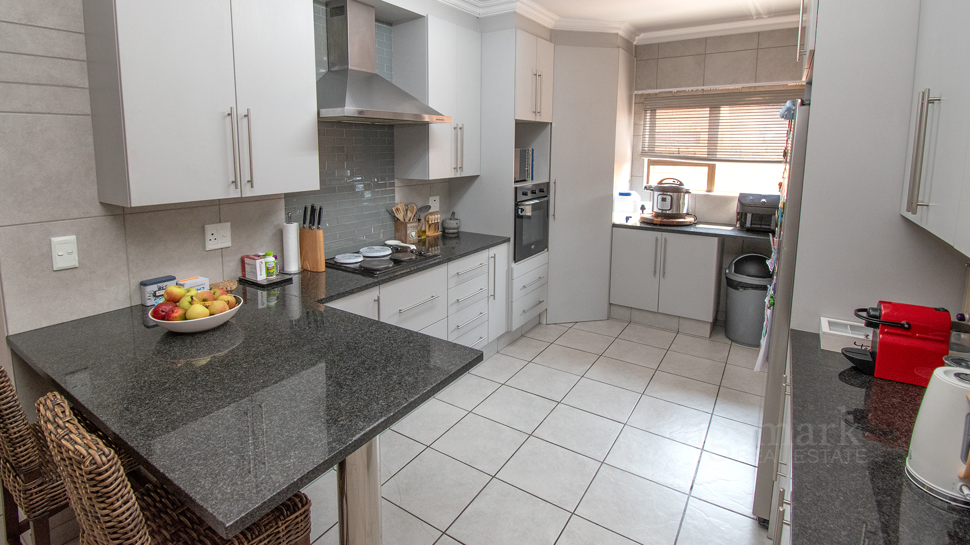 The open-plan kitchen is thoughtfully designed with ample cupboard space, a semi open plan scullery, accommodation for three under-counter appliances, and space for a double-door fridge.
